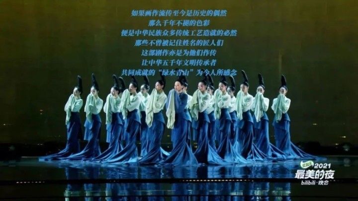 改变也会发生在B站上对于前沿文化形式的总结和升华。这几年,B站突然多了很多国风舞蹈内容相关视频。察觉到年轻人的喜欢,B站便与河南卫视合作打造了舞蹈剧情综艺《舞千年》。2021年末,B站“最美的夜”跨年晚会上,还展现了火出国门的舞蹈作品《只此青绿》。