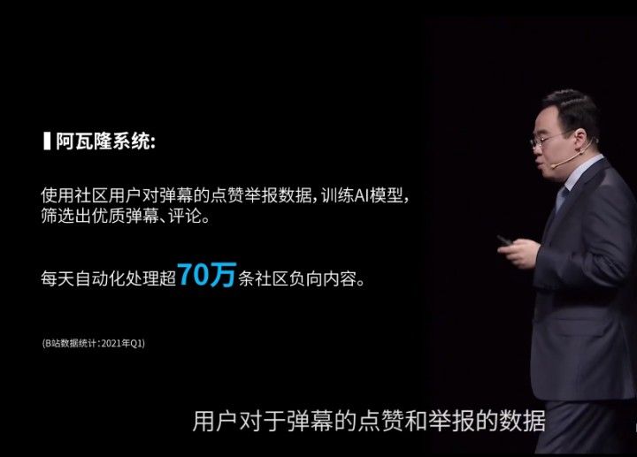 为此,B站内部上线了用于处理网暴等负面信息的AI系统。这套系统被命名为“阿瓦隆”,这个名字来自动画《Fate》里的宝具,象征着正义的宝剑。2021年,在B站12周年的演讲里,CEO陈睿介绍阿瓦隆系统每天可以处理70万条社区负面内容。