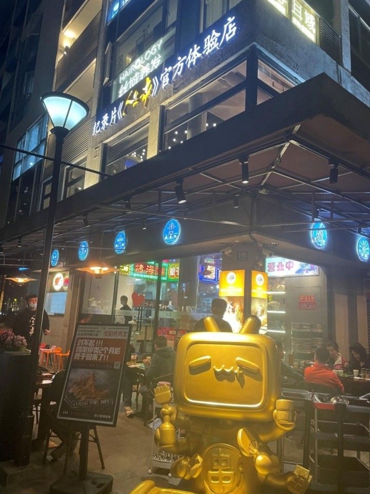 夜幕降临,B站员工三三两两聚在附近大学路上的“人生一串”体验店,这个在B站上爆火的纪录片,也在附近开了实体店,几乎成为了B站员工们的夜间食堂。店门口同样伫立着一个电视机,成为不少大学生们打卡的网红地点。