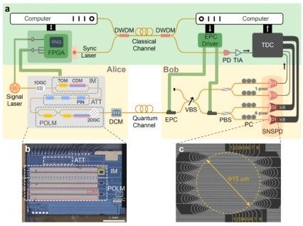 潘建伟、徐飞虎研究组发展了集成光子片上高速高保真度偏振态调制技术,系统重频达到2.5GHz,量子比特误码率优于0.35%;结合中科院上海微系统所最新研制的八像素SNSPD,实现了高计数率、高效率的单光子探测;同时,研究组发展了偏振反馈控制、高速后处理模块等。在上述技术突破的基础上,研究团队实现了10公里标准光纤信道下115.8 Mb/s的密钥率,较之前纪录提高了约一个数量级;系统稳定运行超过50个小时,在传输距离328公里下码率超过200b/s。上述研究成果表明,量子密钥分发可实现百兆比特率的实时密钥分发,满足高带宽通信需求,对未来量子通信的大规模实际应用具有重要意义。