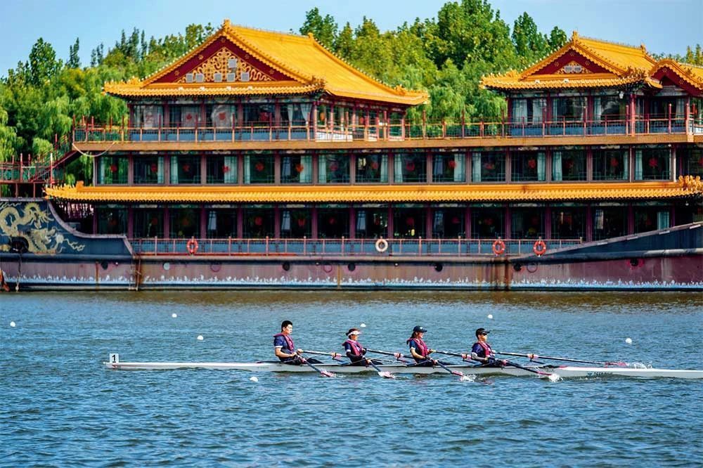 市民在位于北京市通州区的京杭大运河上进行赛艇比赛(2022年9月18日摄) 彭子洋摄/本刊