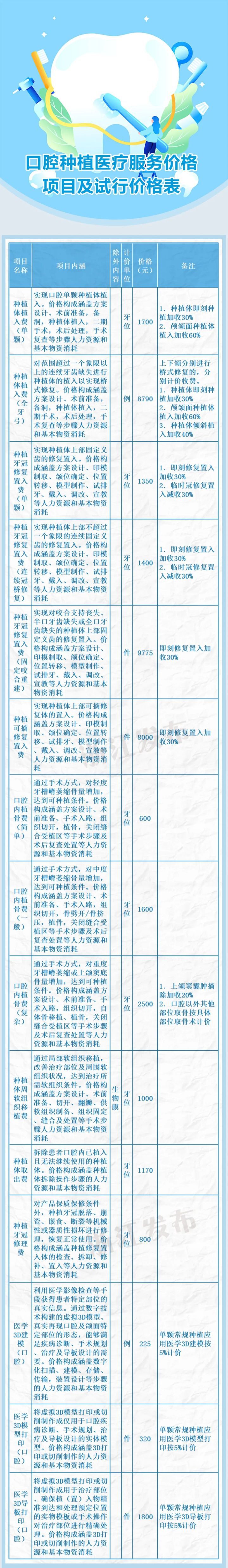 设立种植体植入费(单颗)等15项口腔种植医疗服务价格项目,并实行政府指导价管理,制定在杭省级公立医疗机构试行价格,删除33H0008口腔种植自主定价的医疗服务项目。