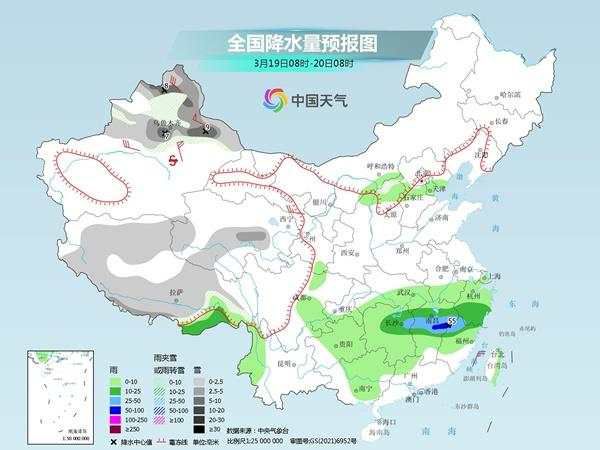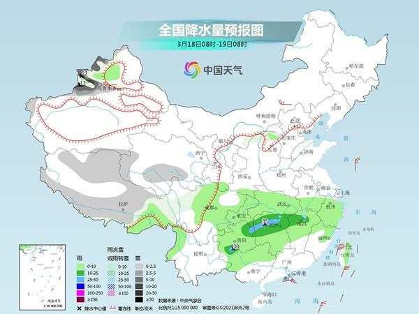 中央气象台预计,新疆西北部、西藏北部和南部、青海西部和南部、川西高原北部、陕西北部、山西北部等地部分地区有小到中雪或雨夹雪,其中,新疆沿天山部分地区有大到暴雪;西藏东南部、云南西北部、西南地区东部、江汉、安徽南部、江南大部、广西北部等地部分地区有小到中雨,其中,湖南北部、贵州东北部和西南部等地部分地区有大雨。