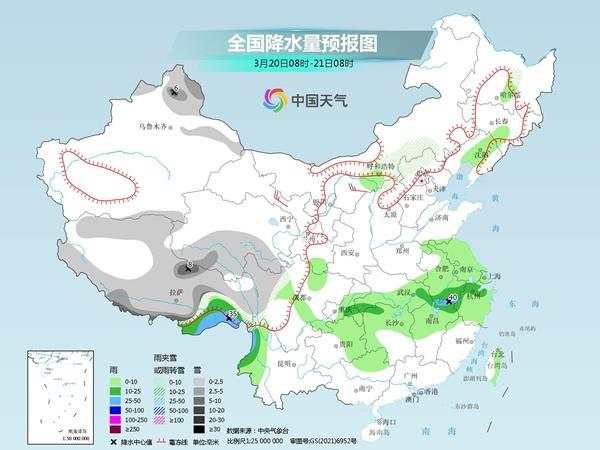 昨天,南方降雨持续,强度明显减弱,北方雨雪主要出现在新疆北部等地。监测显示,昨天08时至今天06时,新疆北部、青海南部、西藏东部、川西高原北部等地出现小到中雪或雨夹雪,新疆塔城和阿勒泰、西藏林芝等局地降水量9~15毫米;江苏南部、上海、江西中部、广西东北部等地出现中雨,局地大雨。