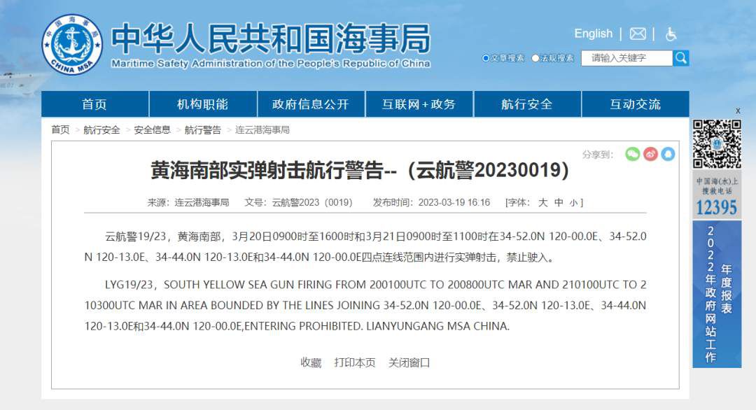 连云港海事局发布航行警告,3月20日9时至16时和3月21日9时至11时,黄海南部部分海域进行实弹射击,禁止驶入。