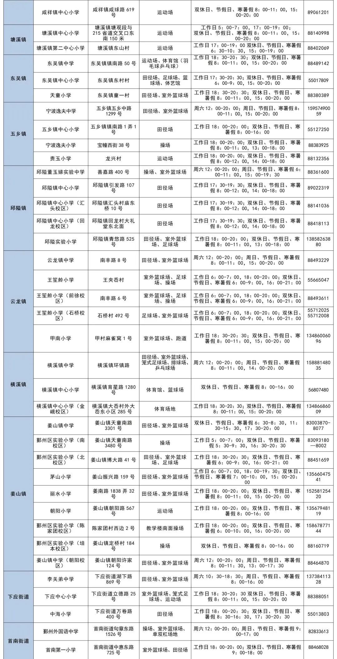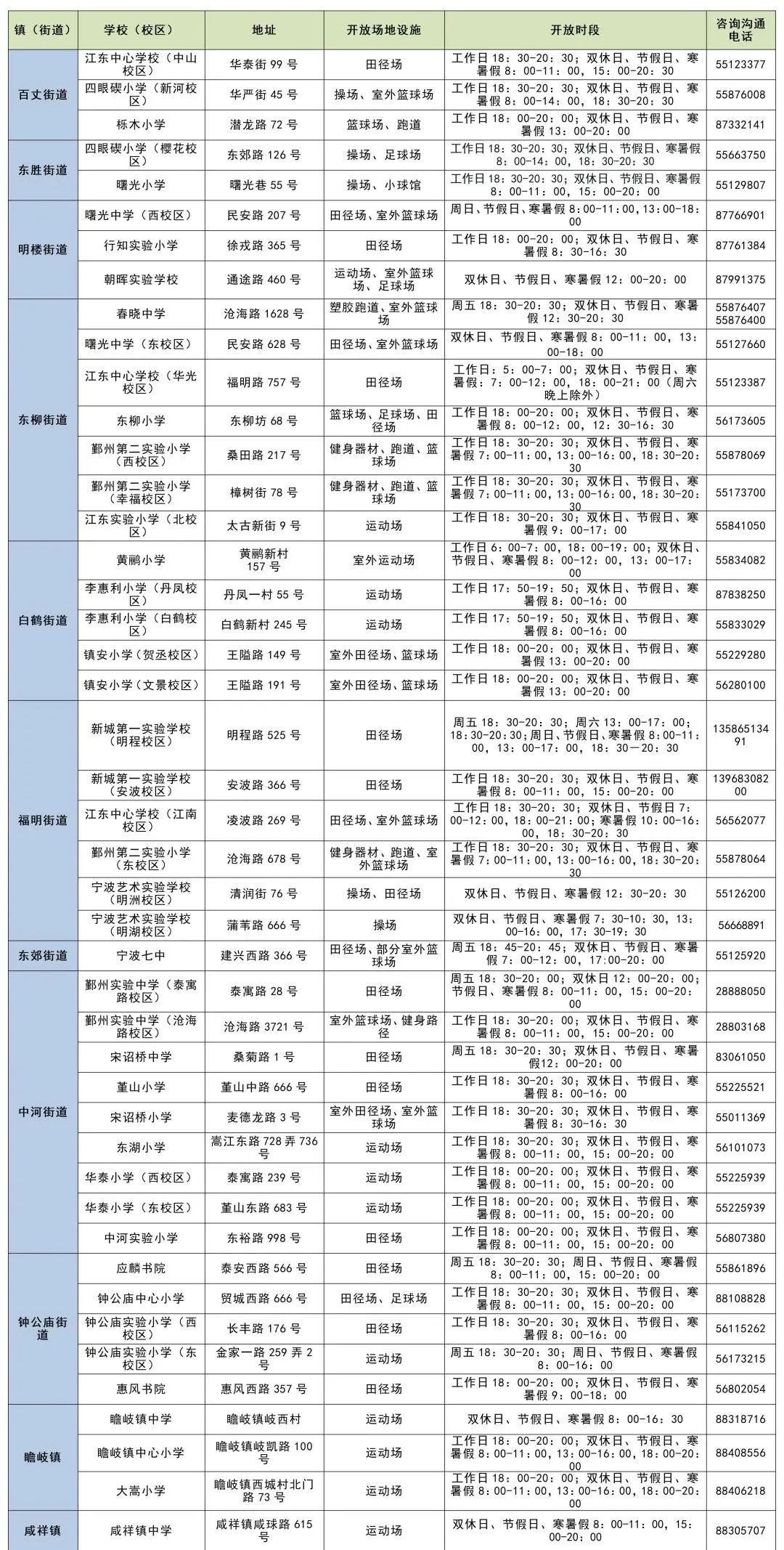 备注:四眼碶中学、钟公庙中学、塘溪镇中学、鄞州第二实验中学、江东实验小学(南校区)、新城第一实验学校(会展校区)由于校园改建维修等原因,学校体育场地设施暂停开放。