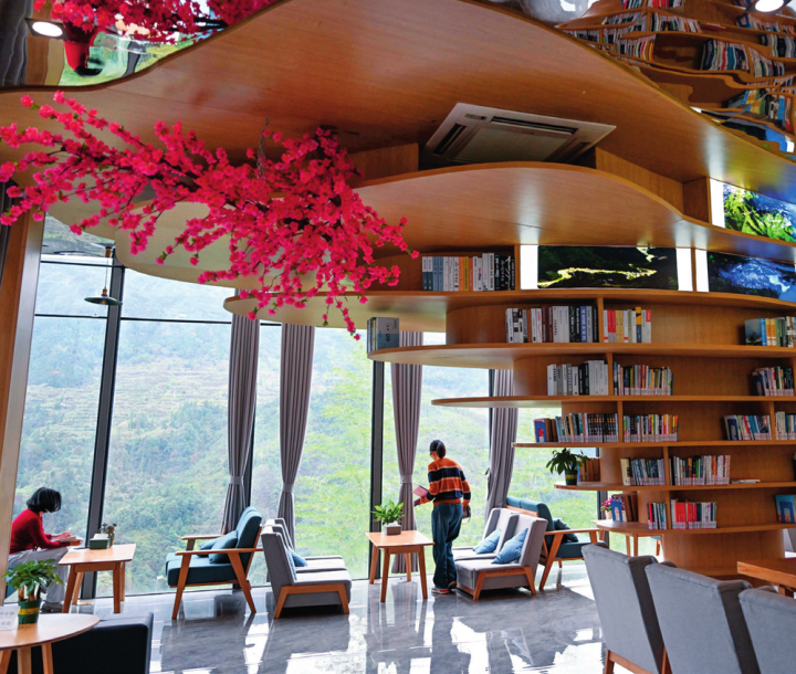 游客在浙江省丽水市青田县小舟山乡的城市书房内看书赏景(2022 年 11 月 24 日摄)徐昱摄 / 本刊