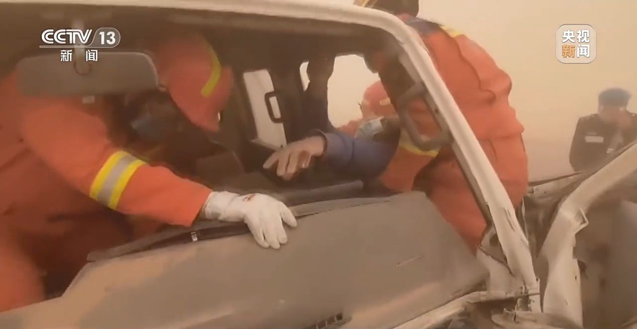 当天下午,甘肃金塔县因受沙尘暴影响,发生了四车追尾事故,其中农用车驾驶室严重变形,驾驶员被困住,无法挣脱。风沙之中,经过20分钟的救援,救援人员成功将被困者救出送医。与此同时,沙尘暴已奔赴内蒙古阿拉善边境,同样的沙墙再次出现。