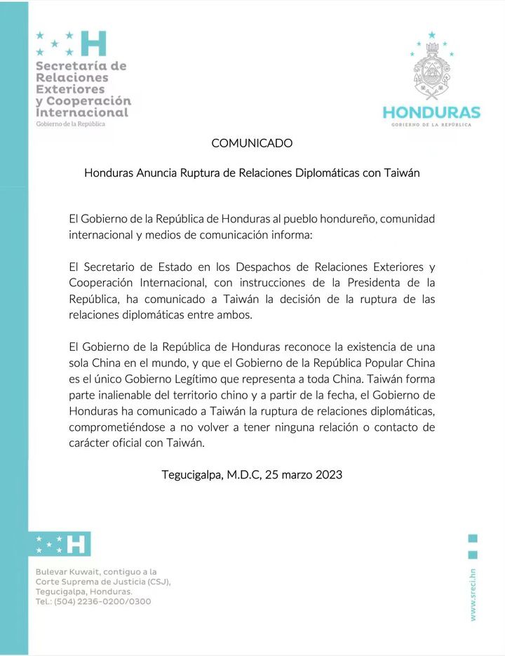当地时间3月25日,洪都拉斯外交部发表声明,正式宣布与中国台湾断绝“外交关系”。