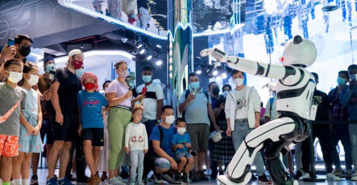 在迪拜世博会中国馆,熊猫机器人优悠同游客进行互动。优必选科技供图