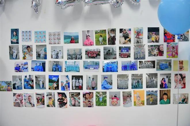 △医院的照片墙上记录着三年前医护人员与新生儿的日常