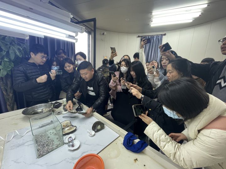 现场,枫江村珠农王罗永正在直播间忙碌,看到网络名博采风团一行,他一边开蚌一边向大家介绍,“我在村里有300多亩珍珠养殖基地,去年纯利润达百万元,不过这样的经营规模放在全村看其实并不大。”