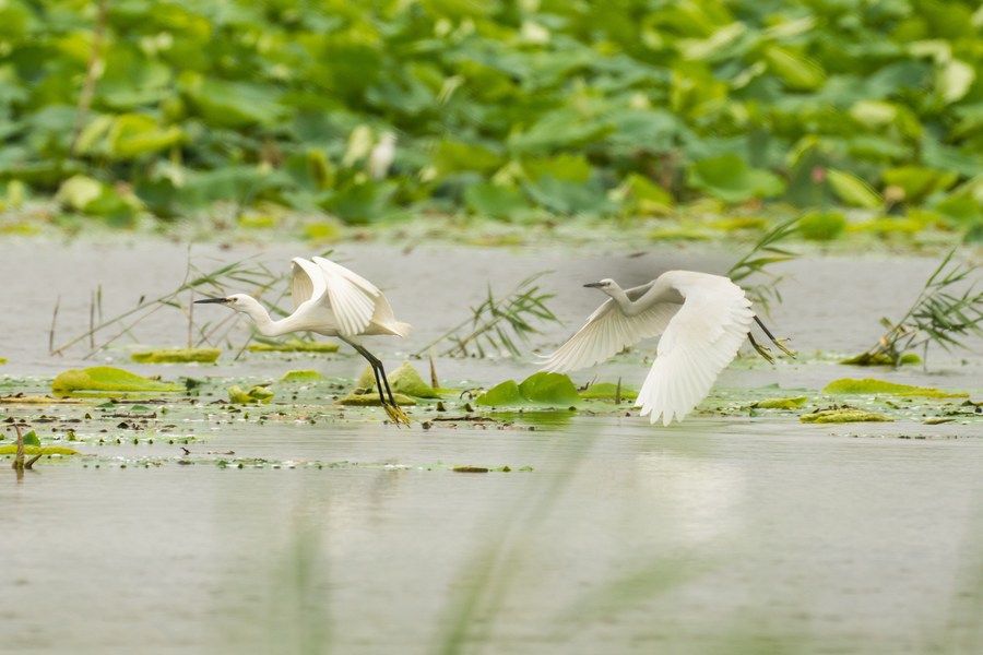 白鹭在白洋淀水面上飞舞(2022年7月10日摄)。