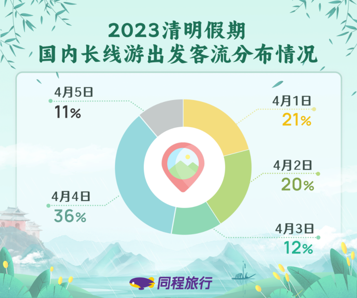 尽管清明只有1天假期,但“拼假族”们依然选择利用年假在清明假期前后来一次长途旅行。来自同程旅行平台度假线路搜索及咨询预订数据显示,清明假期前后国内长线游与出境游需求旺盛,表现出良好的复苏势头。其中,国内游热门目的地主要有云南、广西、贵州、四川、海南、湖南、北京、陕西、河南、广东等。国内长线跟团游出游天数一般在4至6天之间,以4月4日出发的线路客流量相对较大,占比36%。