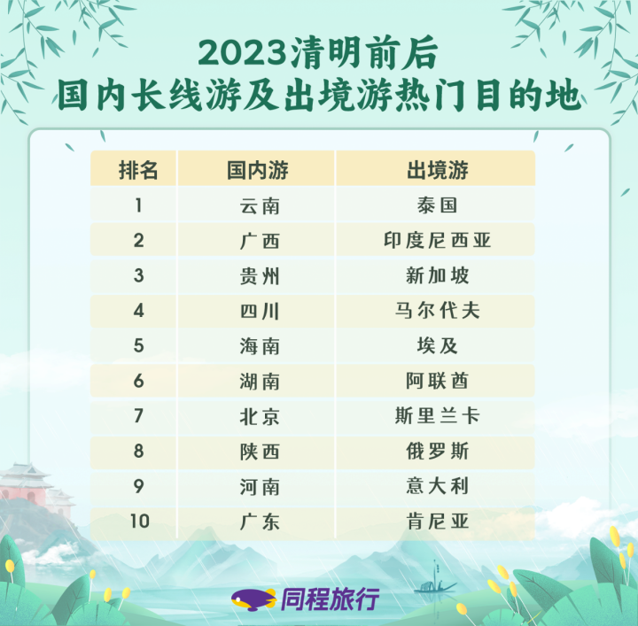 除了传统跟团游外,清明前后出发的私家团、定制团需求也较大。清明前后各地的春季旅游节庆活动今年基本正常举办,例如洛阳牡丹节、云南普洱市景谷傣族彝族泼水节等吸引了全国游客的关注。北京、江西、湖北等地的春游专列在清明假期之前陆续开行,为人们假期旅游提供了新选择。长线赏花游线路主要以传统春游目的地最受欢迎,例如,江西婺源、无锡鼋头渚、广州宝墨园等都是赏花主题线路的热门目的地。
