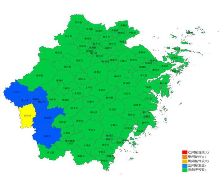 根据省气象台未来降雨预报,预计4月4日8时至5日8时,柯城区、衢江区、常山县、开化县、遂昌县、龙泉市可能发生山洪灾害(蓝色预警),江山市发生山洪灾害可能性较大(黄色预警)。
