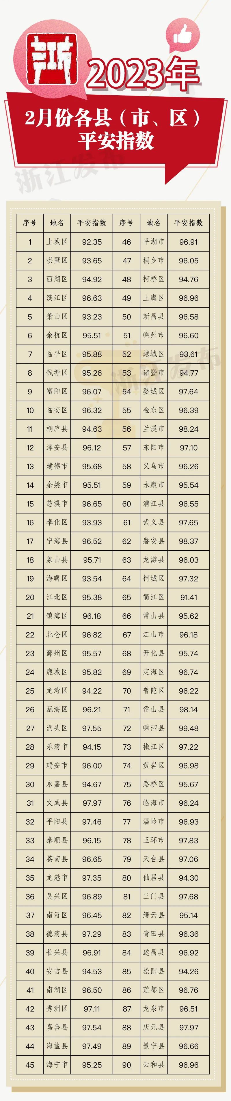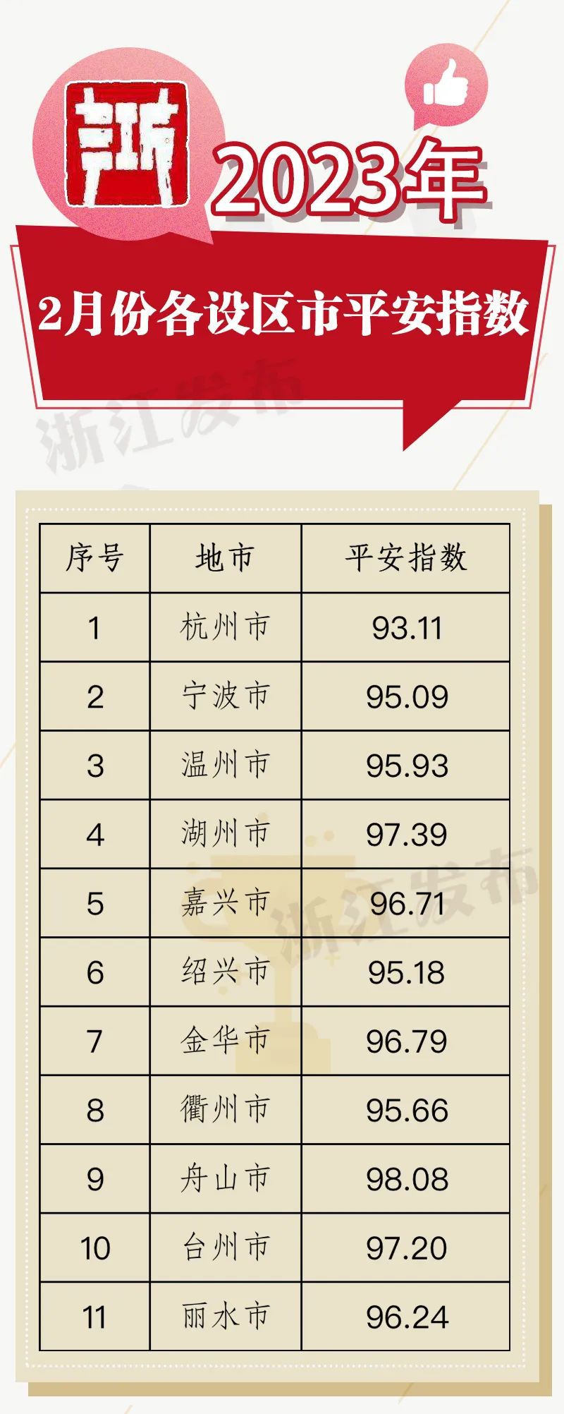 浙江是全国第一个省级公开发布平安指数的省份,平安浙江指数涵盖了市域与县域两个层面,包含对11个设区市的比较,也涵盖了对全省县(市、区)平安状况的评价。2023年2月情况如下↓↓