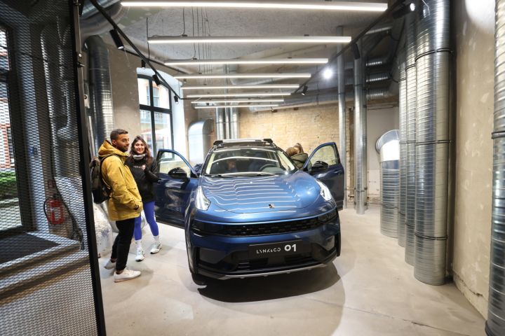 领克汽车柏林体验店内,几个外国年轻人正在试驾。