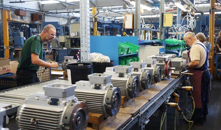 德国斯图加特,卧龙集团韦尔茨海姆工厂内,工人正在流水线上作业。