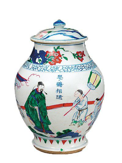 五彩琴鹤相随人物图盖罐。故宫博物院藏