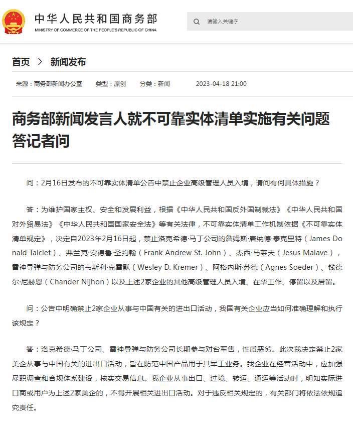 答:为维护国家主权、安全和发展利益,根据《中华人民共和国反外国制裁法》《中华人民共和国对外贸易法》《中华人民共和国国家安全法》等有关法律,不可靠实体清单工作机制依据《不可靠实体清单规定》,决定自2023年2月16日起,禁止洛克希德·马丁公司的詹姆斯·唐纳德·泰克里特(James Donald Taiclet)、弗兰克·安德鲁·圣约翰(Frank Andrew St. John)、杰西·马莱夫(Jesus Malave),雷神导弹与防务公司的韦斯利·克雷默(Wesley D. Kremer)、阿格内斯·苏德(Agnes Soeder)、钱德尔·尼赫恩(Chander Nijhon)以及上述2家企业的其他高级管理人员入境、在华工作、停留以及居留。