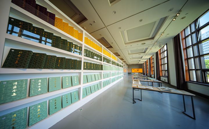 走进展览序厅,一面高大的书墙陈列着“大系”,引得不少观众驻足。本次展览的亮点之一,在于不仅首次全部上架了“大系”目前为止的全系列共计62卷233册,还实现了“大系”和观众的“零距离”——提供了60多册实体书在展厅供观众现场翻阅,这也是“大系”展览的首次尝新举措。