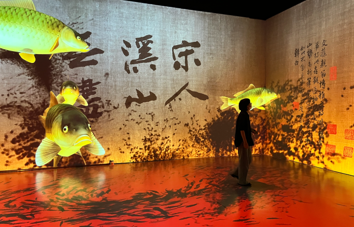 地面行走时,游鱼会跟随;触碰墙面时,孔明灯亮起;地面如雪地,行走时留下印记。在《光影丹青》沉浸式展厅,一幕真实而有趣的交互体验,让观众仿佛走入古画之中。