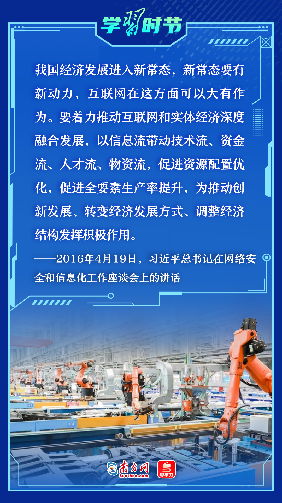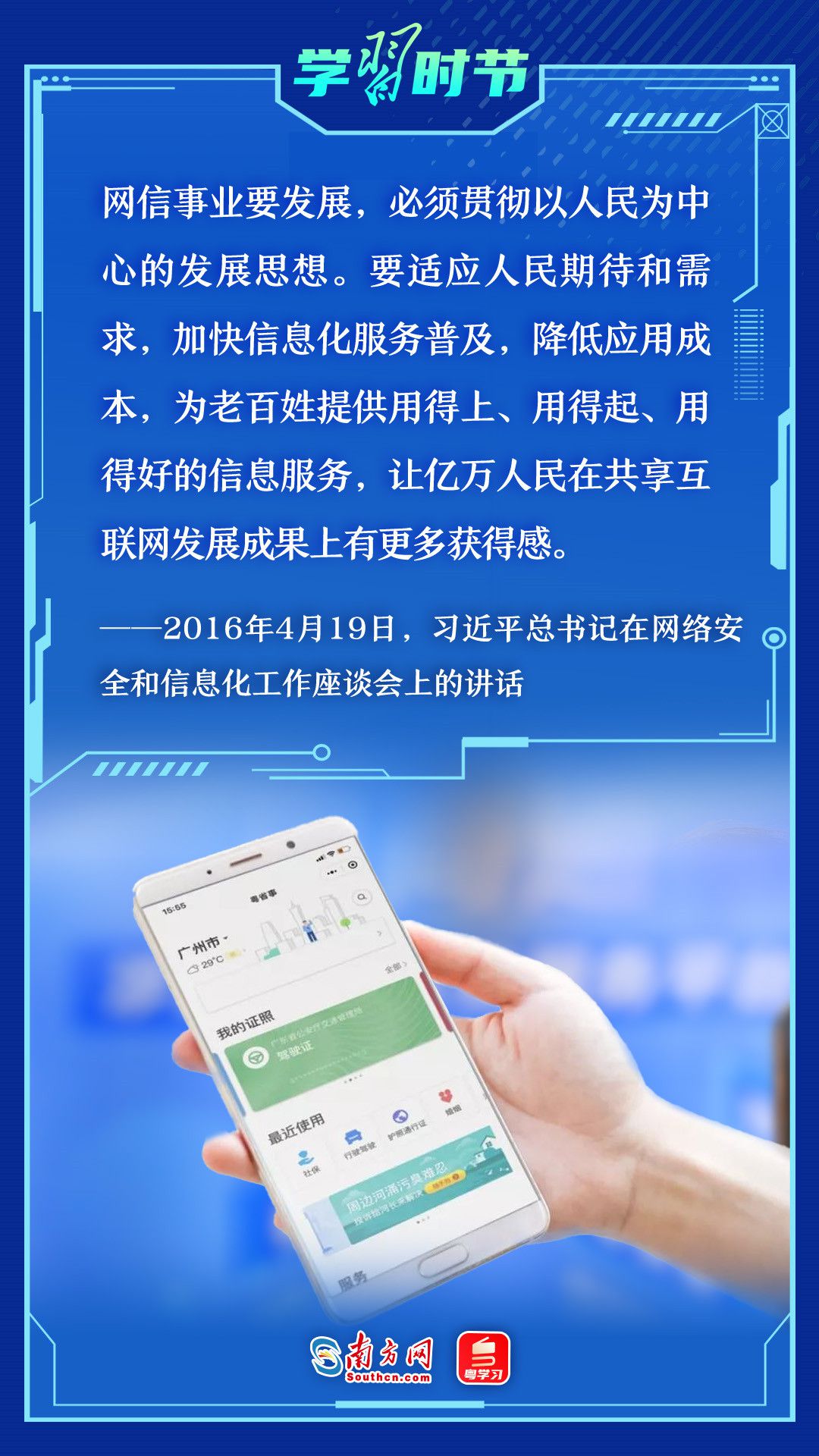 2016年4月19日,总书记在主持召开网络安全和信息化工作座谈会时强调:网信事业发展要在践行新发展理念上先行一步,推进网络强国建设,推动我国网信事业发展,让互联网更好造福国家和人民。