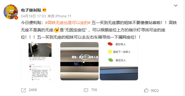 近日,有网友表示,“五一”买到无座票的姐妹不要傻站着啦!高铁无座不是真的无座,是“无固定座位”,可以根据座位上方的指示灯寻找可坐的座位!“五一”买到无座的姐妹可以去左右车厢寻找一下漏网座位!
