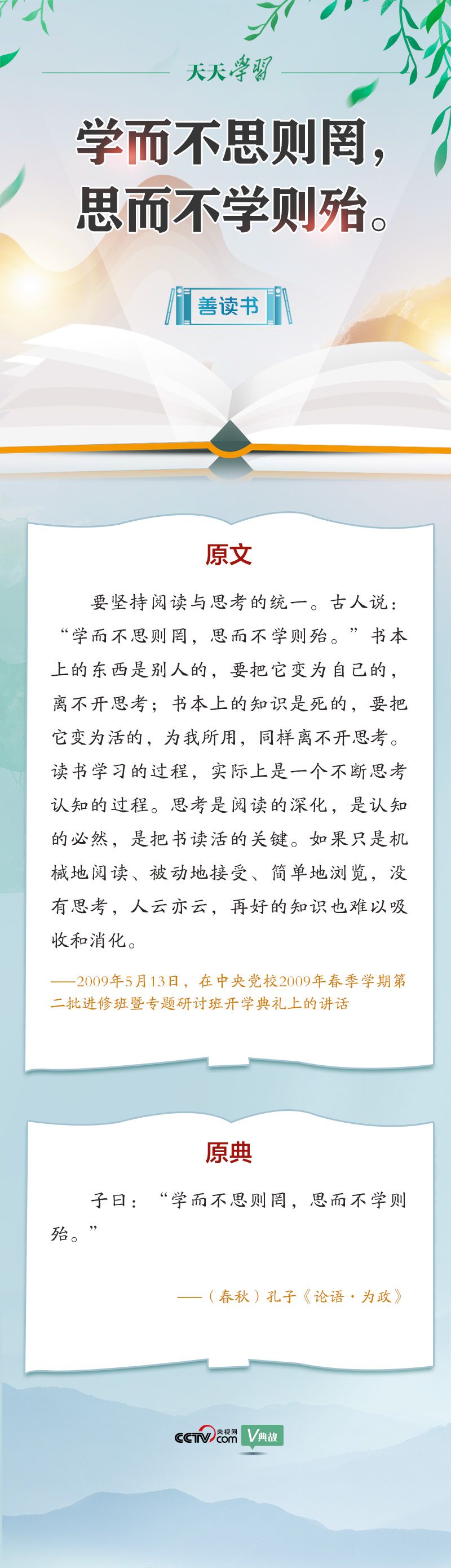 阅读与思考是相辅相成的。只读书而不思考,如同囫囵吞枣。习近平总书记指出:“书本上的东西是别人的,要把它变为自己的,离不开思考;书本上的知识是死的,要把它变为活的,为我所用,同样离不开思考。读书学习的过程,实际上是一个不断思考认知的过程。思考是阅读的深化,是认知的必然,是把书读活的关键。”同时,读书是思考之源。总书记强调:“思考的基础是阅读。终日而思,不如须臾之所学。只有通过阅读获得新知识、了解新思想、树立新观念,才能提高思维的准确性、逻辑性、深刻性、敏捷性、创造性。”他提醒领导干部要同时防止学而不思和思而不学这两种现象。