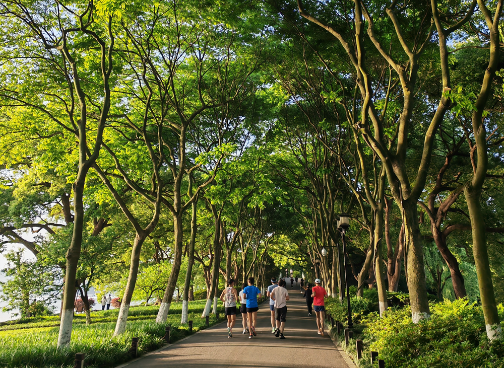 “比平时早1个多小时出门,感受最新鲜的西湖。”苏堤上穿着运动短袖的曹建伟已经跑出了汗。他们一行人绕湖晨跑的习惯,在“五一”假期并没有中断。