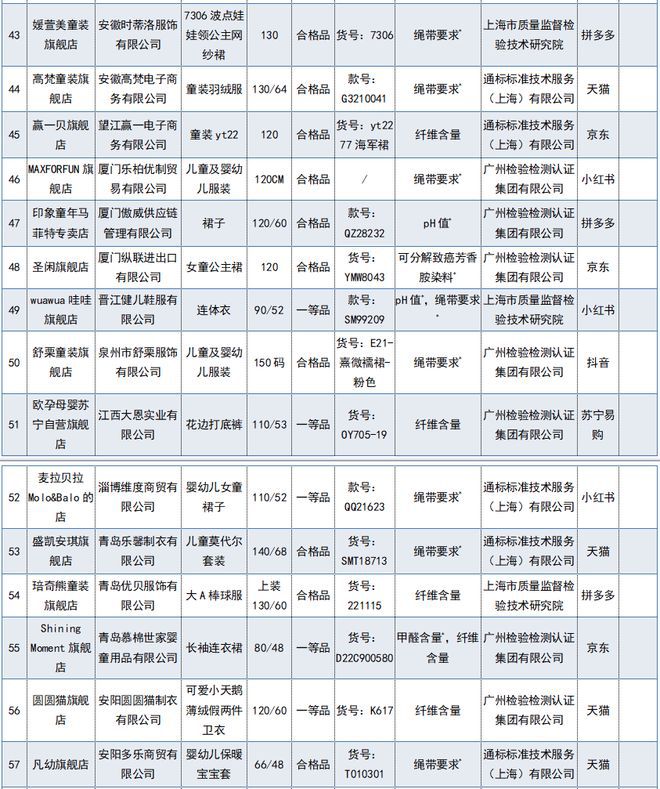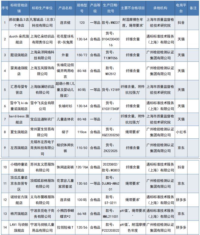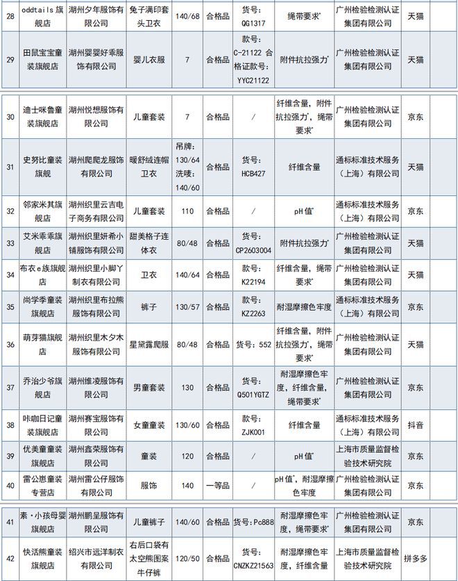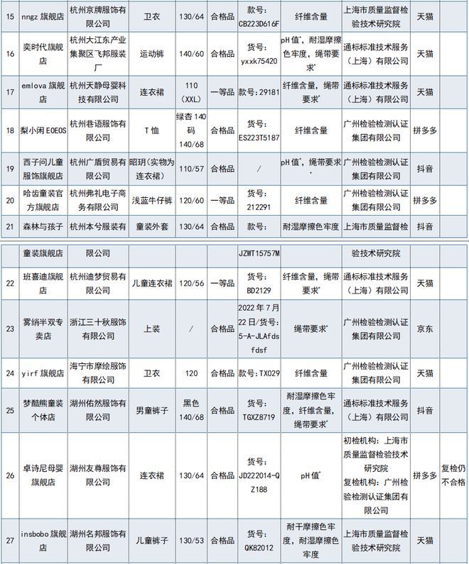 发现不合格项目为甲醛含量、pH值、可分解致癌芳香胺染料、耐干摩擦色牢度、耐湿摩擦色牢度、纤维含量、附件抗拉强力、绳带要求、附件锐利性。其中: