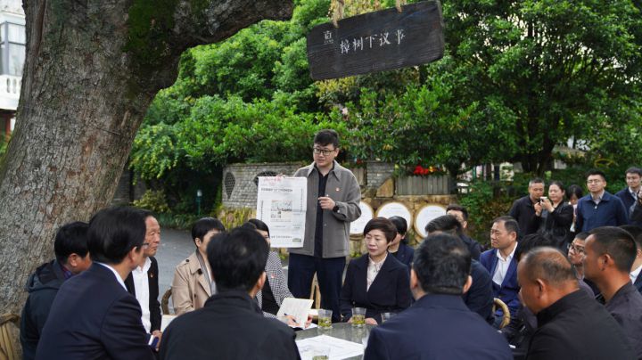 记者和杭州市跨层级跨领域跨部门联合调研组在小古城村大樟树下学习交流。 记者 马赛洁 摄