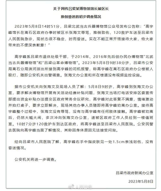 2023年5月8日14时51分,吕梁北武当古兵器博物馆公众号发布公告称:“高宇峰馆长在离石区政府办事时被区长张海文辱骂,推倒致伤,120救护车送至吕梁市人民医院急诊,现状态很不稳定,时而昏迷。实在不能正常开馆接待大家,给大家带来的不便深表歉意!”
