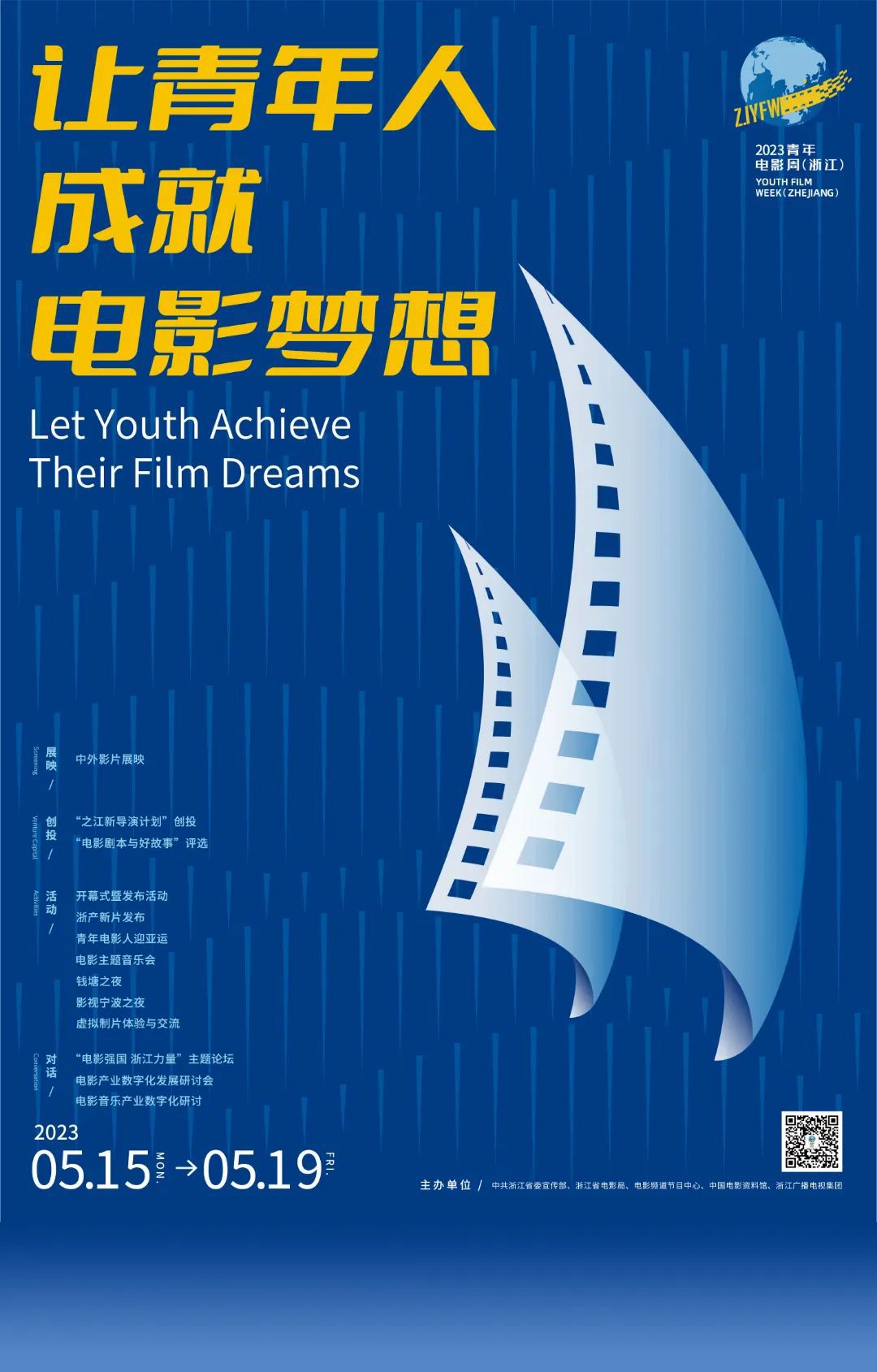 2023青年电影周(浙江)由中共浙江省委宣传部、浙江省电影局、电影频道节目中心、中国电影资料馆、浙江广播电视集团联合主办,以“让青年人成就电影梦想”为主题,将于5月15日至19日在杭州举行。