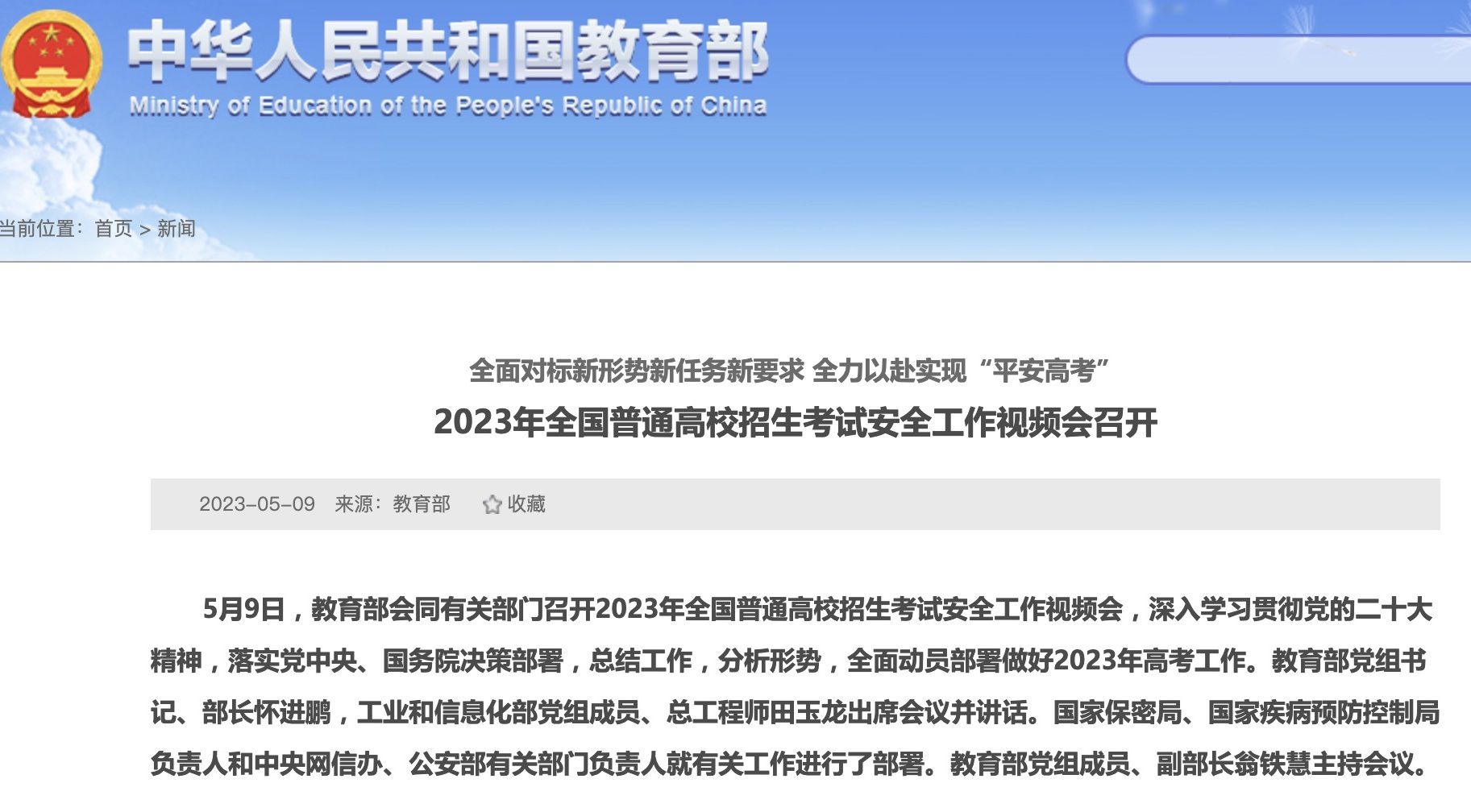 会议要求,要全力保障试题试卷安全,严格考务规范操作,统筹做好考试防疫等工作,深化高考综合改革,深化考试内容改革,统筹推进相关专项改革,继续开展“高考护航行动”,解决好考生“急难愁盼”,做好信息发布和政策解读,加大各类涉考涉招培训机构治理,全力以赴实现“平安高考”目标任务。