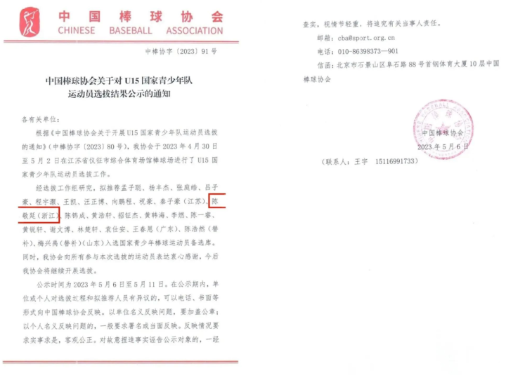陈敬延是浙江入选的唯一一名队员,将代表中国参加2023年U15亚洲青少年棒球锦标赛,同时有望参加2028年洛杉矶奥运会。