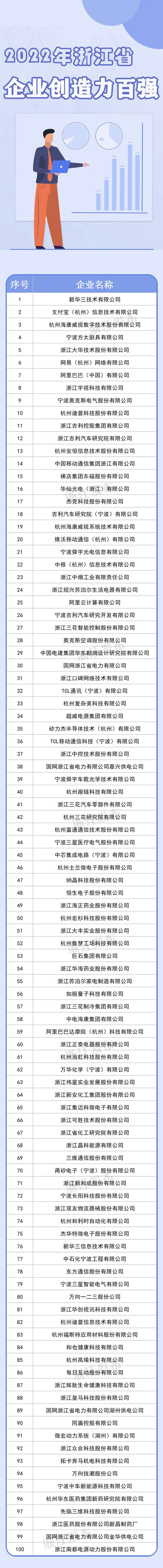 日前,省知识产权协会公布了2022年浙江省创造力百强企业榜单。榜单主要根据上一年度企业的有效发明专利数量、高价值发明专利数量、近三年发明专利授权数量三项指标综合评价得出。