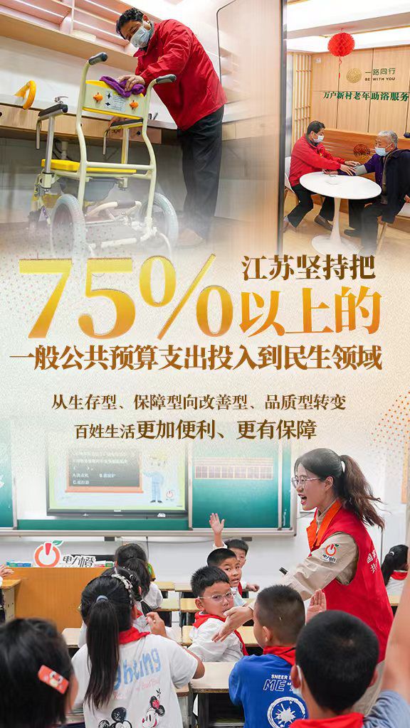 ◆ 人民幸福安康是推动高质量发展的最终目的。不断满足人民对美好生活的向往,江苏坚持尽力而为、量力而行,兜牢民生底线,提升全生命周期公共服务质量,在推动高质量发展中创造高品质生活。新时代以来,江苏坚持把75%以上的一般公共预算支出投入到民生领域,实现更高水平的“民生七有”。
