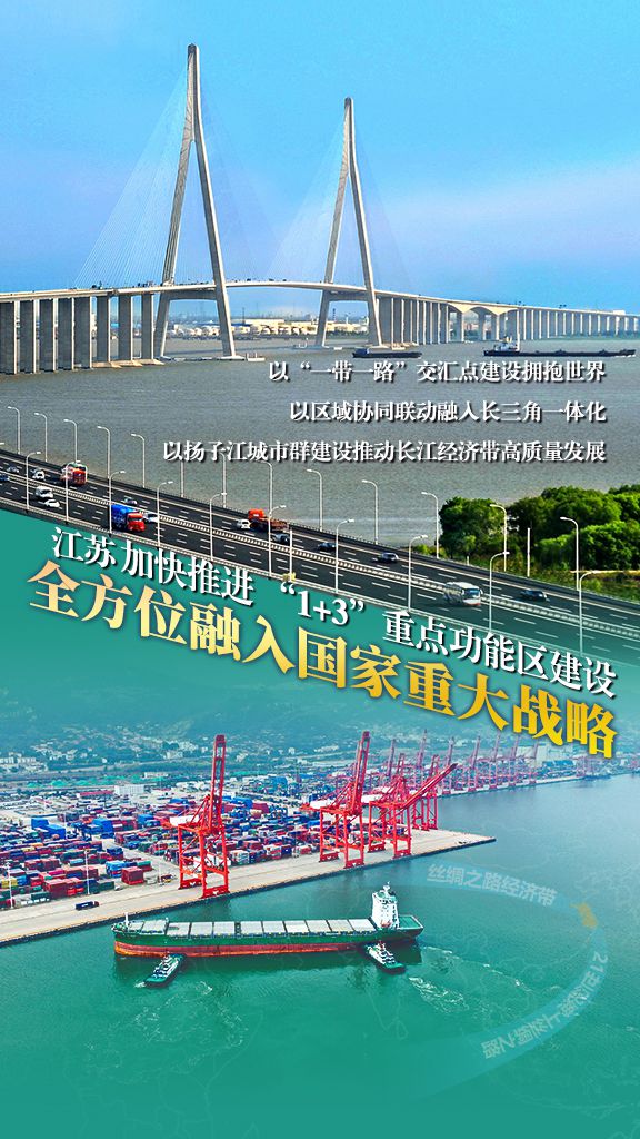 提要钩玄,纲举目张。以“一带一路”交汇点建设拥抱世界,以区域协同联动融入长三角一体化,以扬子江城市群建设推动长江经济带高质量发展……江苏以大视野谋篇大格局,加快推进以扬子江城市群和沿海经济带、江淮生态经济区、徐州淮海经济区中心城市为总体布局的“1+3”重点功能区建设,全方位融入国家重大战略,更好服务全国构建新发展格局。