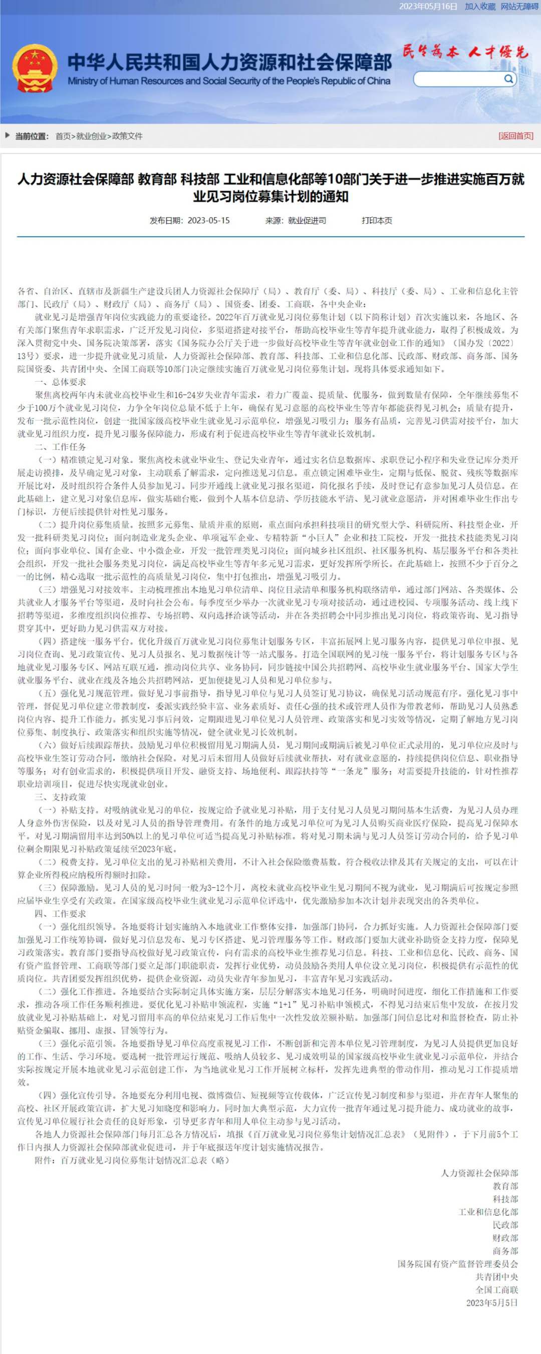日前,人社部、教育部、科技部、工业和信息化部、民政部、财政部、商务部、国务院国资委、共青团中央、全国工商联等十部门印发《关于进一步推进实施百万就业见习岗位募集计划的通知》(以下简称《通知》),决定继续实施百万就业见习岗位募集计划,帮助高校毕业生等青年提升就业能力。