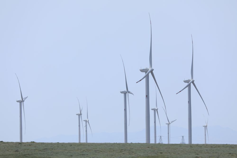 图为2021年5月24日在哈萨克斯坦扎纳塔斯拍摄的风电场的风机。新华社发(奥斯潘诺夫摄)