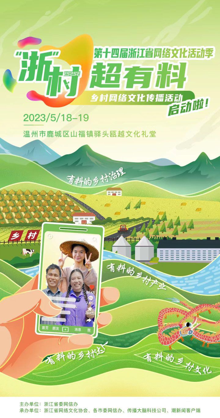 5月19日,由浙江省委网信办主办,浙江省网络文化协会、各市委网信办、传播大脑科技公司、潮新闻客户端承办的“‘浙’村超有料”乡村网络文化传播活动将在“山城相拥、海陆交融”的温州拉开帷幕,旨在展现浙江乡村的魅力与活力,共同探索超有料的乡村网络文化盛宴。