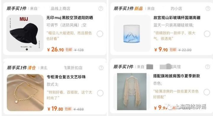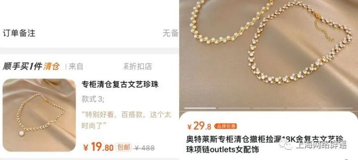 例如,一款标价128元的遮阳防晒帽,“顺手买1件”的包邮价(以下简称“顺手价”)为26.9元;一款标价129元的小丝巾,顺手价9.9元;更有一款标价488元的“专柜清仓复古文艺珍珠项链”,顺手价只要19.8元。