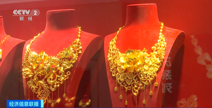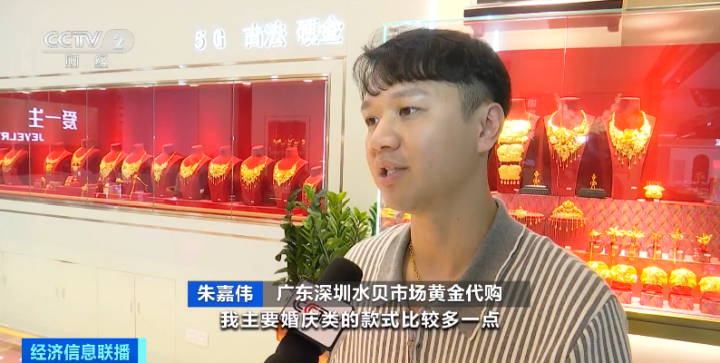 广东深圳水贝市场黄金代购 朱嘉伟 :代购量比去年增加40%到50%左右,我主要是婚庆类的款式比较多,像有手镯、戒指、耳钉等的一个套装,每个月有一两百套左右,基本每套都是上百克。