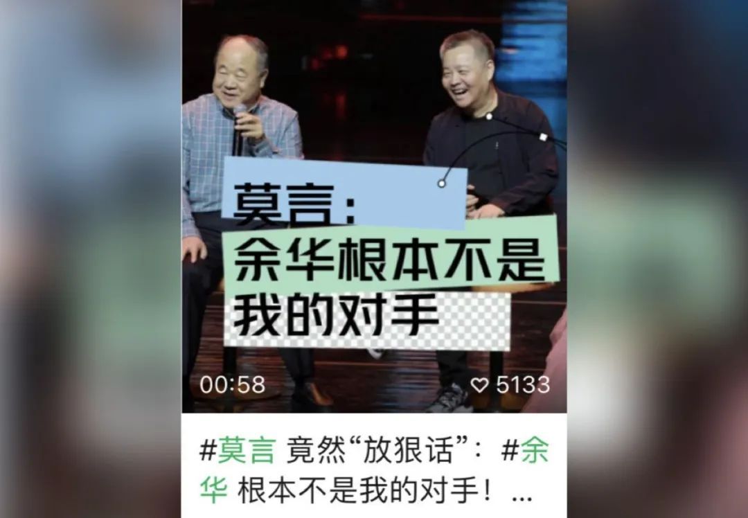近日,一则短视频标题映入笔者眼帘:“莫言竟然‘放狠话’:余华根本不是我的对手”。难道莫言、余华两位文学大咖也要互怼不成?惊异、疑惑、好奇之心驱使笔者点开视频,才发现是《收获》杂志创刊65周年庆典上,莫言、余华两位嘉宾互动时的“戏言”。