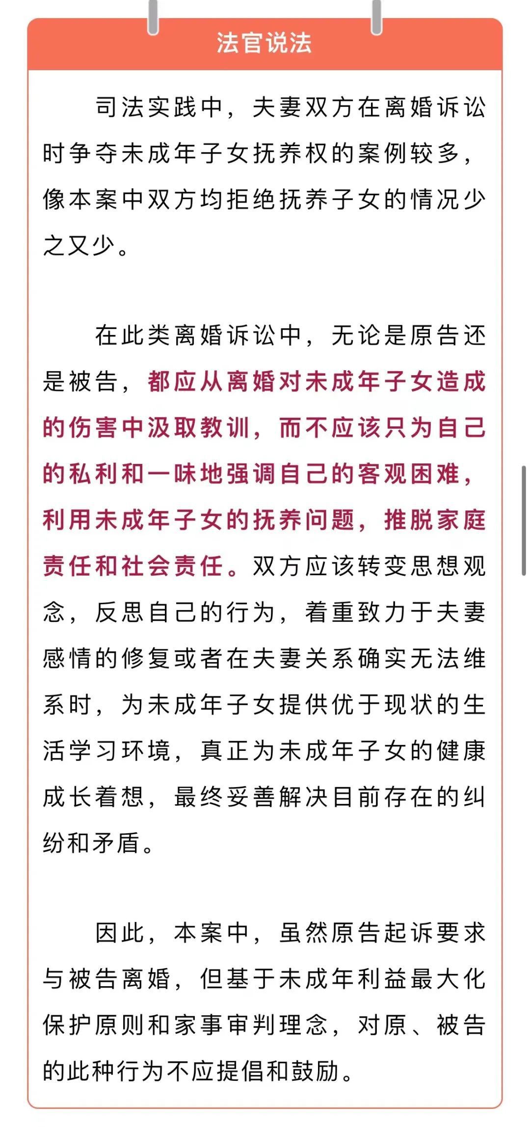 法院审理认为,夫妻二人在抚养子女问题上互相推诿,严重违反婚姻家庭道德规范和公序良俗,直接侵害了未成年人的合法权益。