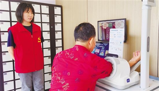 程金林老人在24小时健康小屋测量血压。记者 戚祥浩 摄