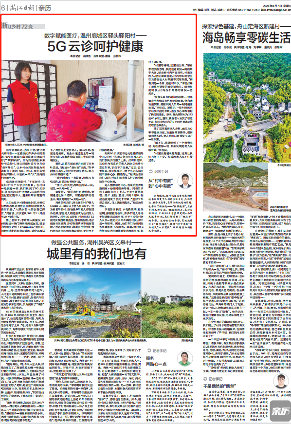 周密告诉我们,驿头驿阳村户籍人口2281人,60岁以上老人有522个。作为著名华侨村,当地很多年轻人都在国外打拼,家里老人的健康成为他们最大的牵挂。利用5G云诊室,村民在家门口就可实现自助量血压、自助测血糖、电子健康档案查询、诊疗数据共享等健康管理,“若遇到疑难病,值班医生会帮忙预约连线省市医师视频云会诊,更好呵护村民的健康。”