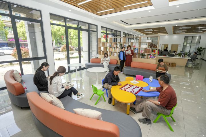 在湖州市长兴县太湖街道新溪未来社区,社区居民在共享会客厅内进行休闲活动。图片来源:新华社
